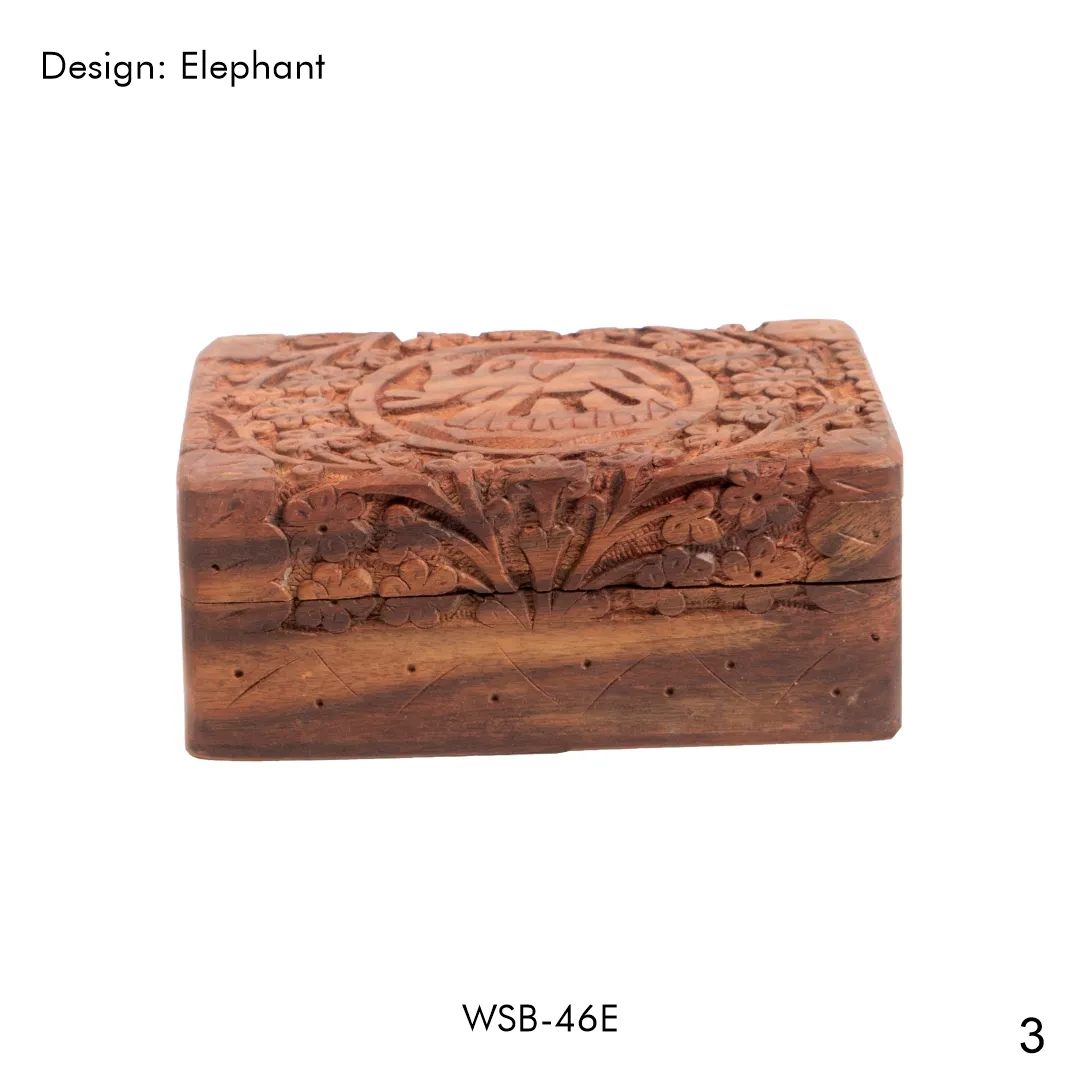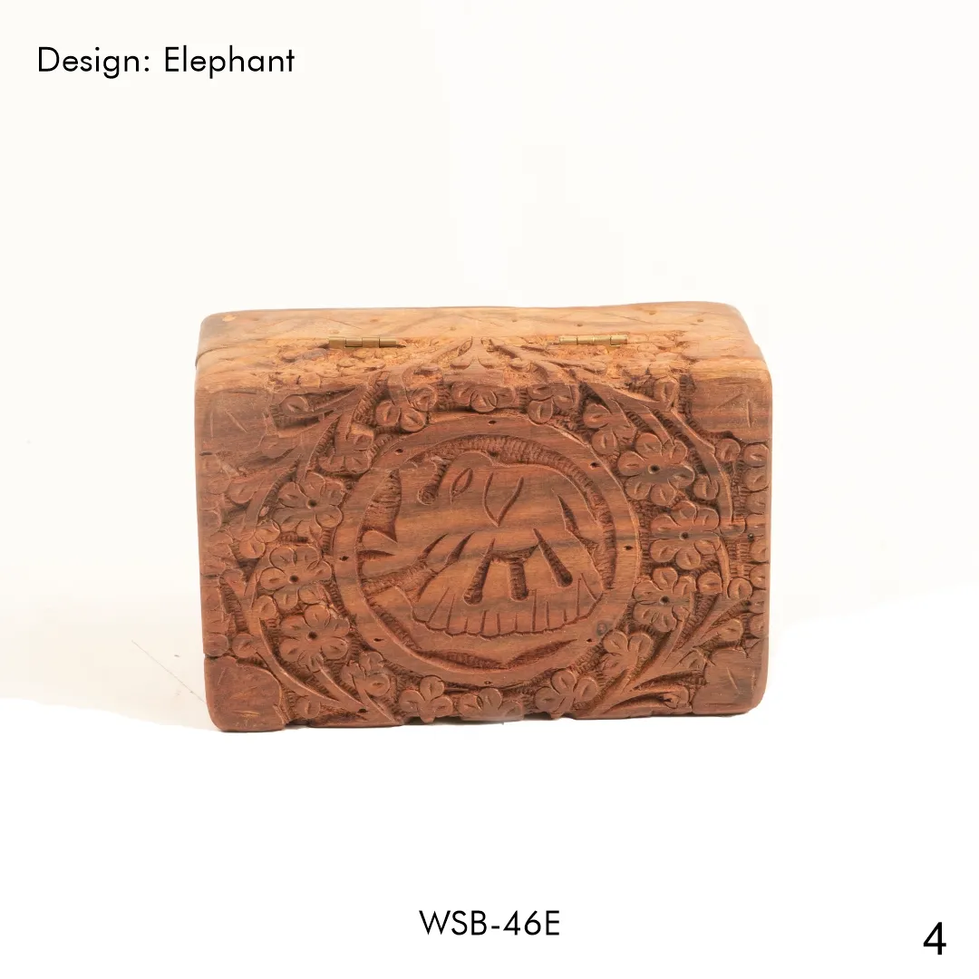 Description: This beautifully carved wooden storage box features an elephant design, symbolizing wisdom, strength, and good fortune. Perfect for storing jewelry, small trinkets, or other personal belongings.
