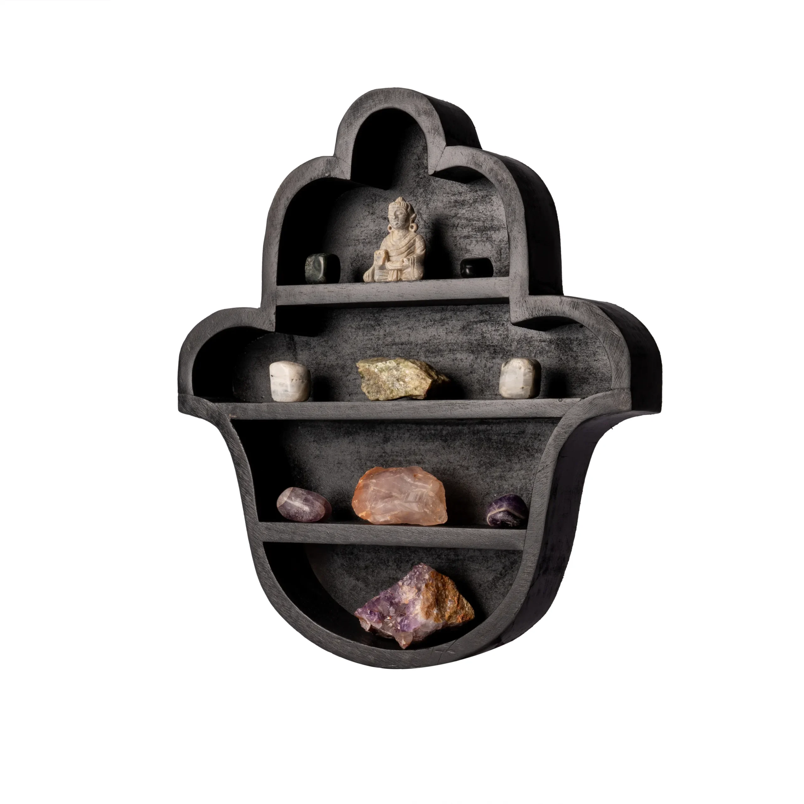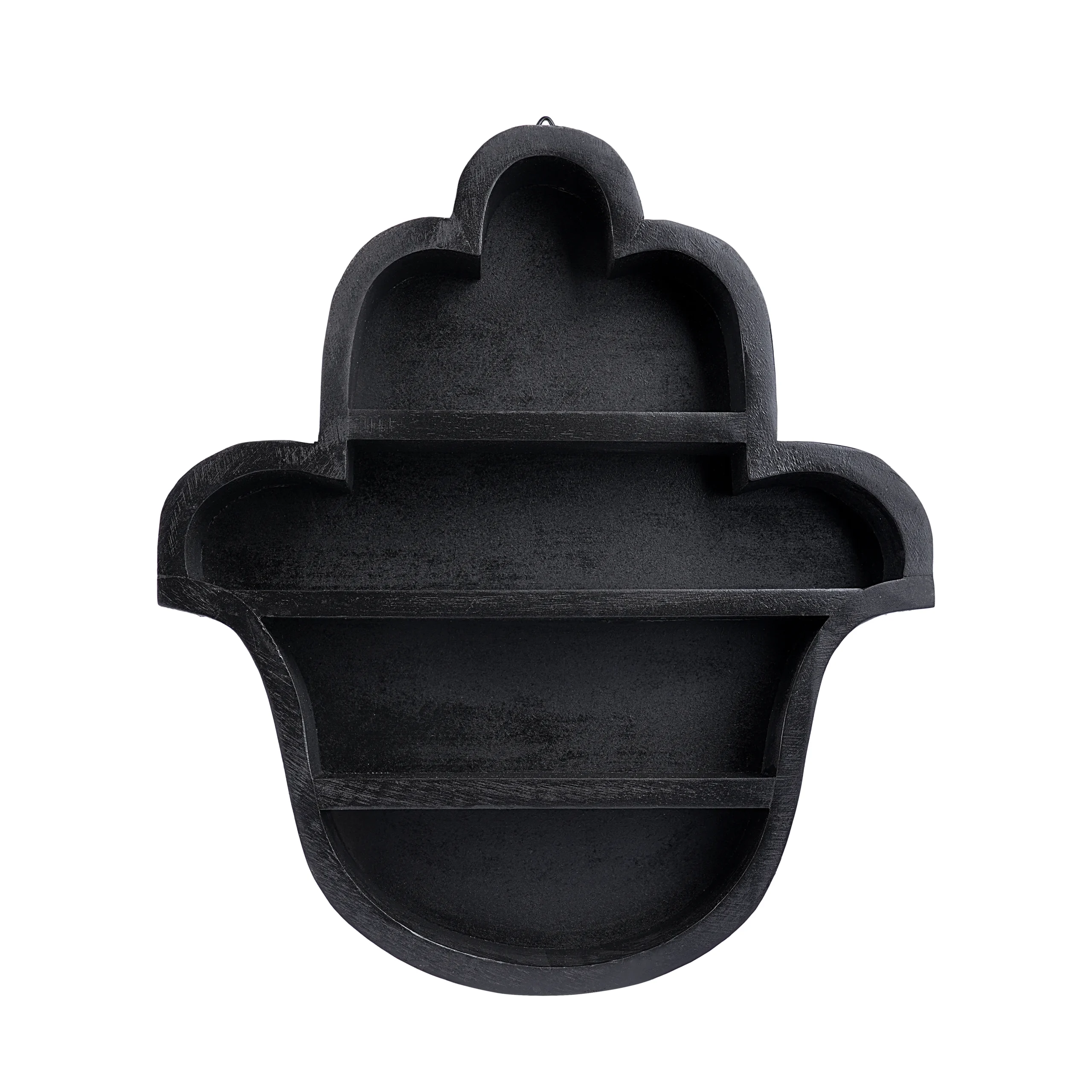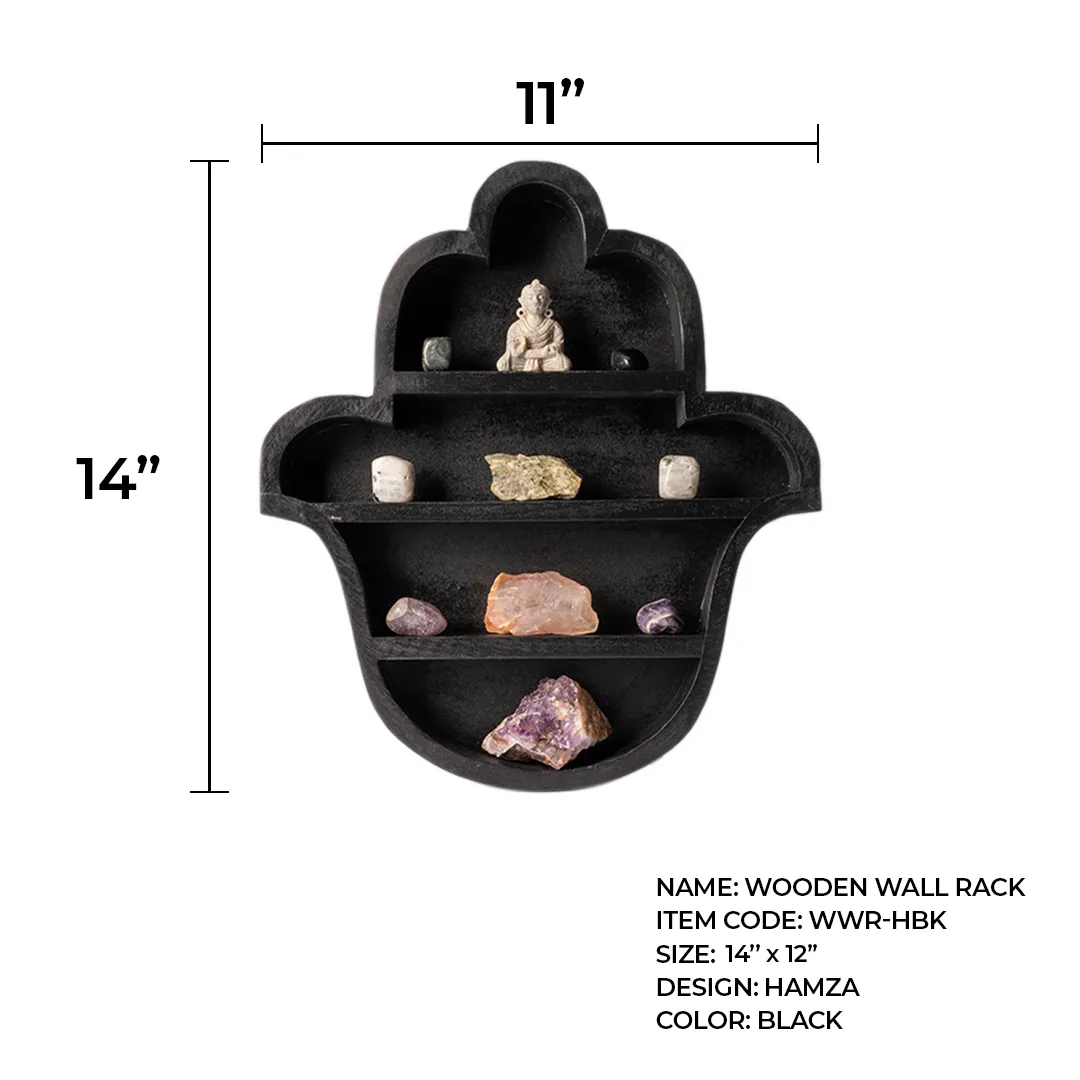 Description: This stylish wall rack features the hamsa hand symbol, known for its protection and blessing. Perfect for displaying small decorative items or plants. The black finish adds a touch of sophistication to any room.