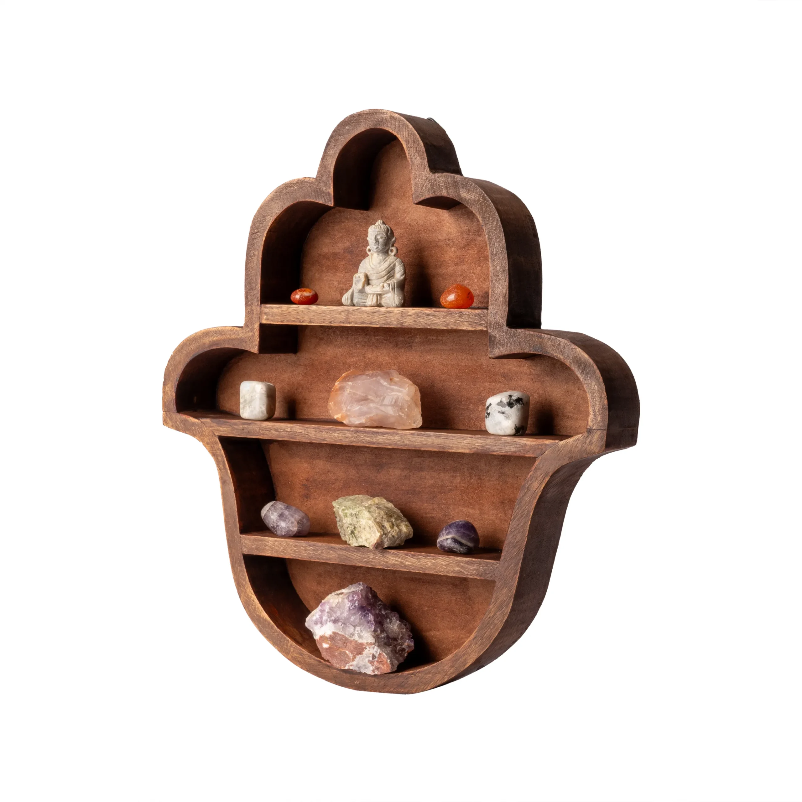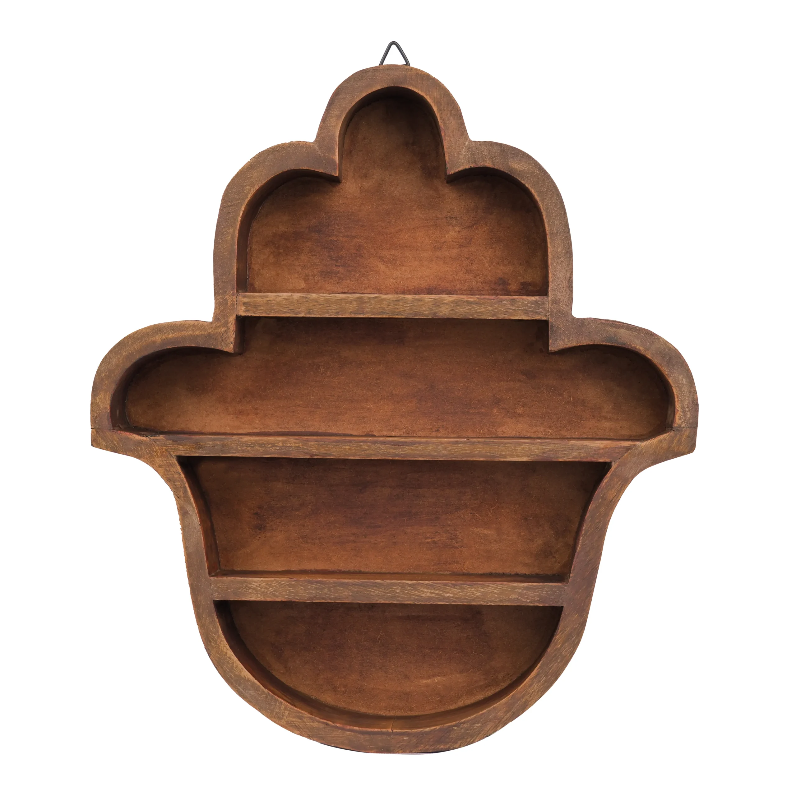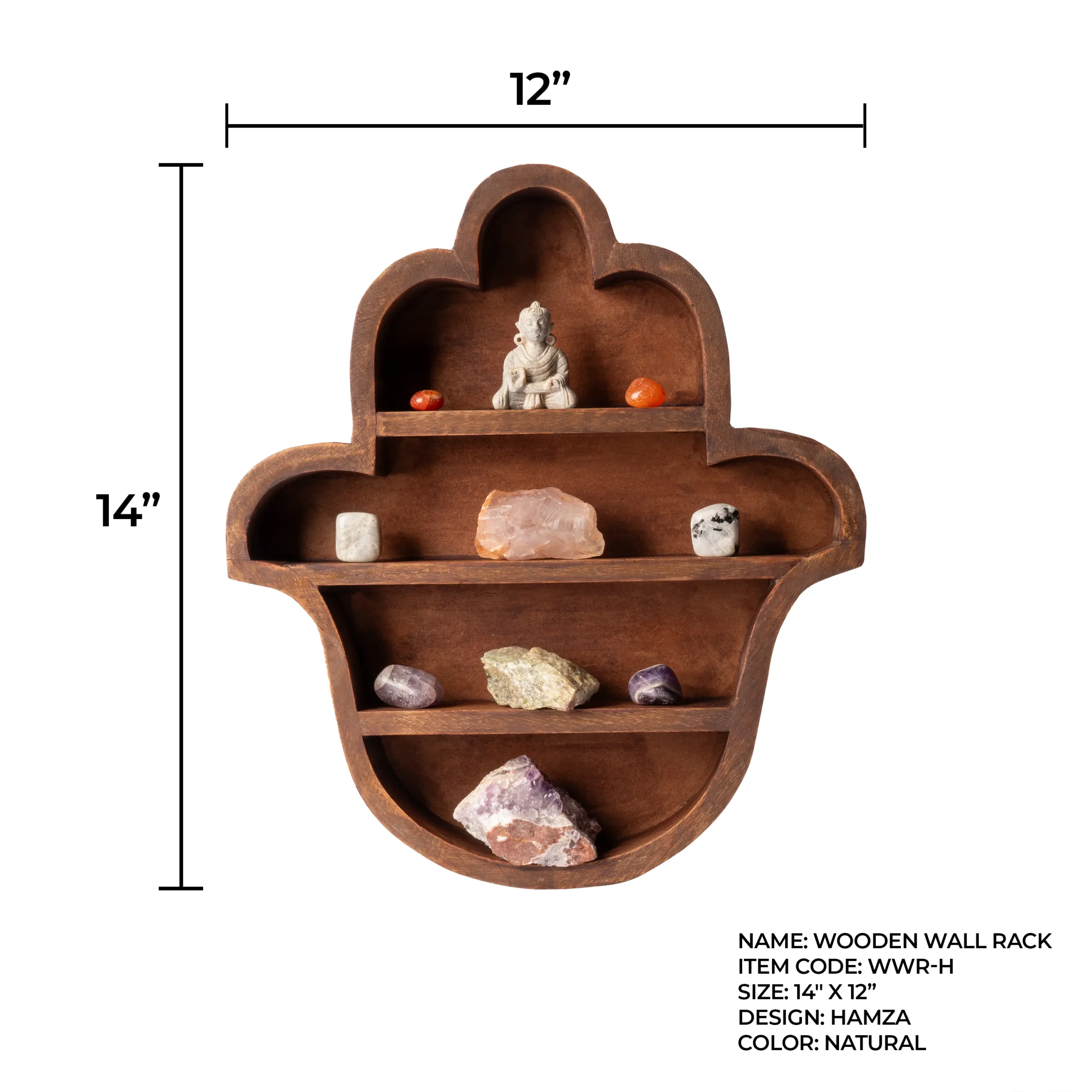 Description: This versatile wall rack features the hamsa hand symbol, ideal for displaying small decorative items or plants. The natural finish adds a warm and rustic touch to any room.